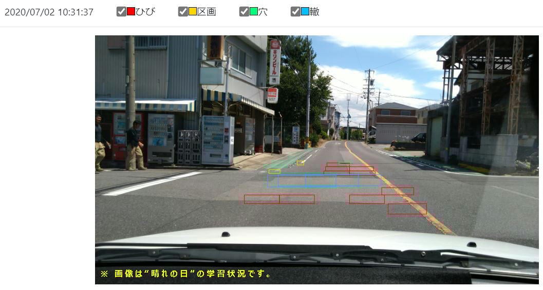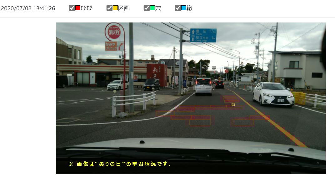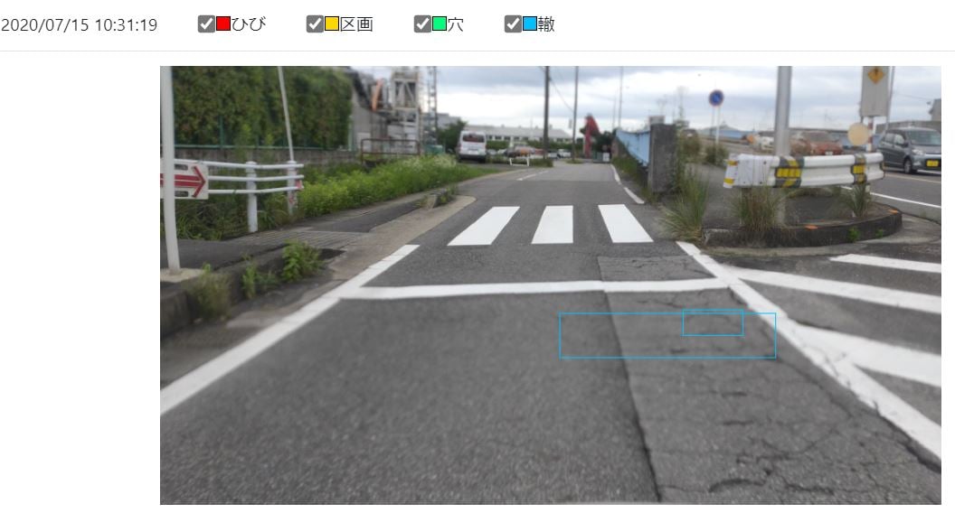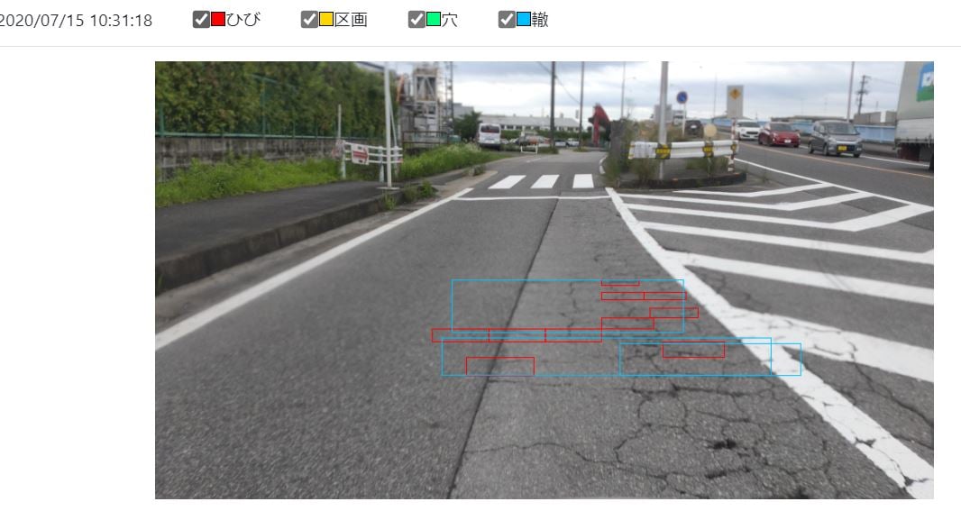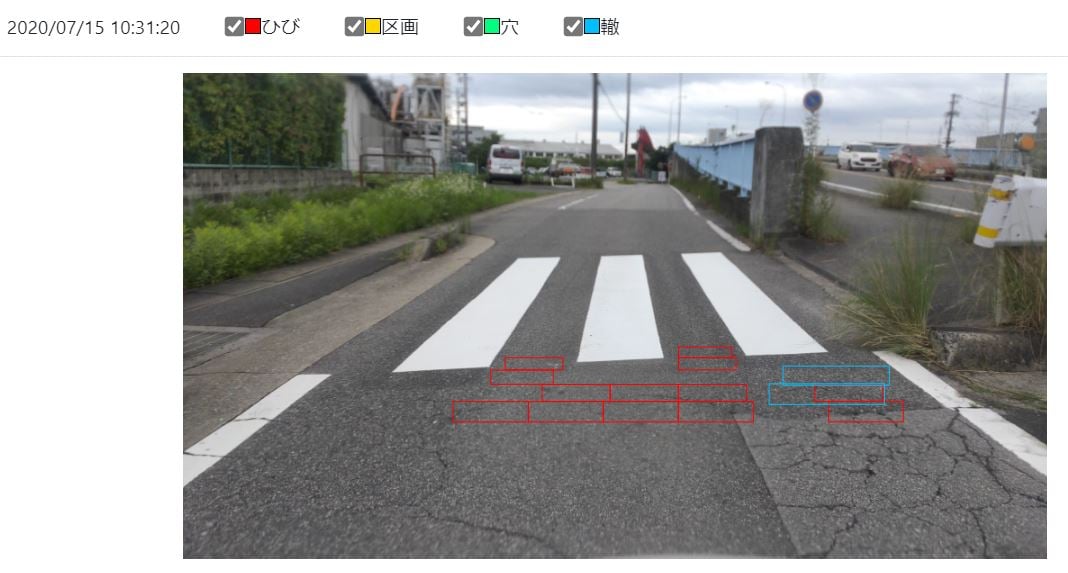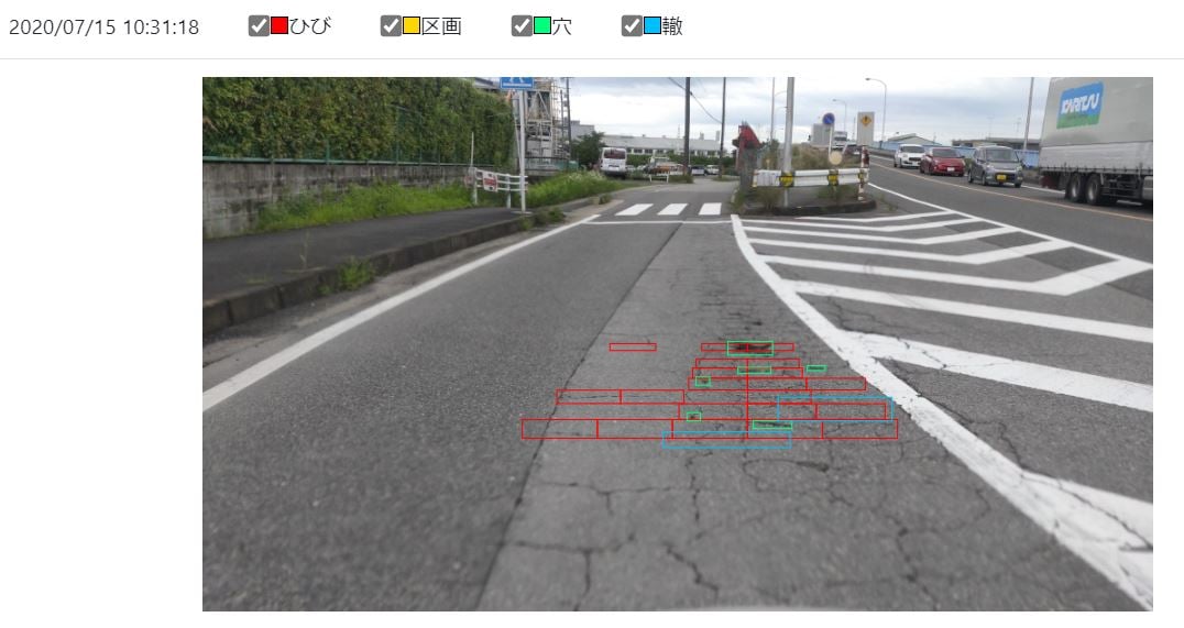 ひび割れ/ポットホール/わだち/区画線の4種類の損傷程度をAIが3段階に自動解析します。